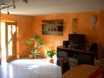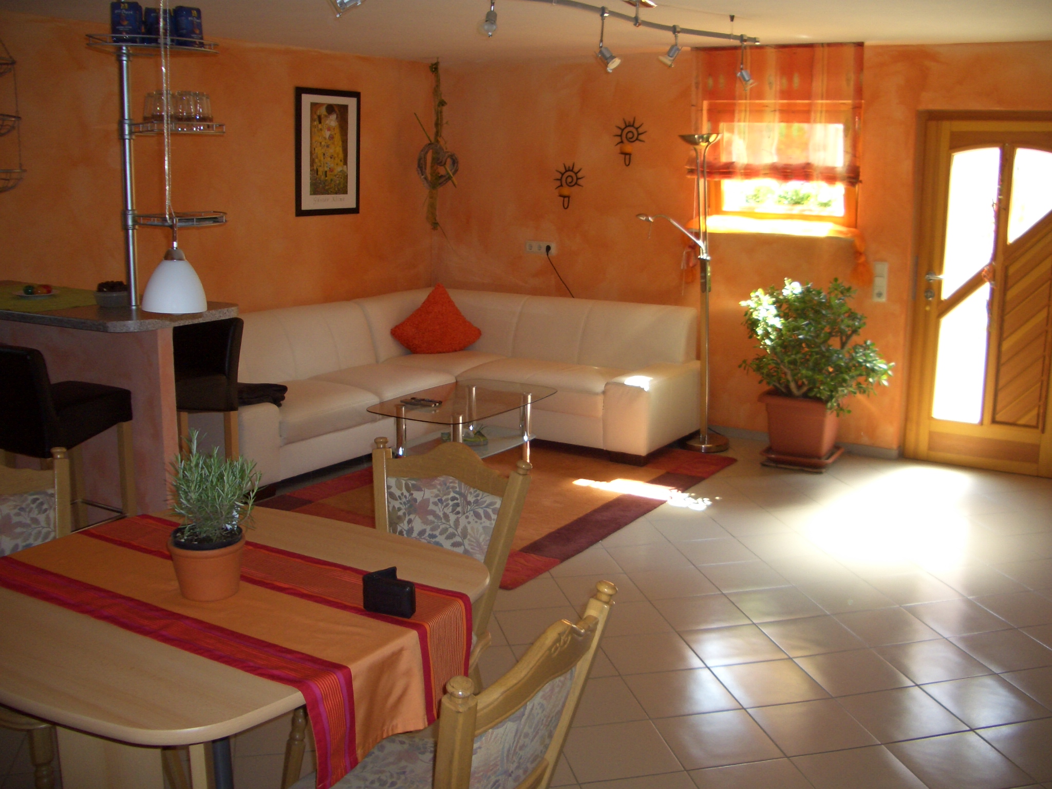 Im Wohnzimmer steht eine gemütliche Ledercouch, eine kleine Minibar und natürlich ein Fernseher. Ein großer Esszimmertisch bietet Platz für 6 Personen.